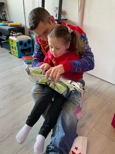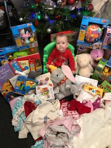 Yes, she loves twinkling lights which there’s more of, but she’d rather be playing with her old, familiar toys than ripping paper off a new one. She’s just not bothered. We pose for a few pictures and then in truth I end up opening most of Isla’s for her because she wants to go in her swing or spin things on the windowsill.