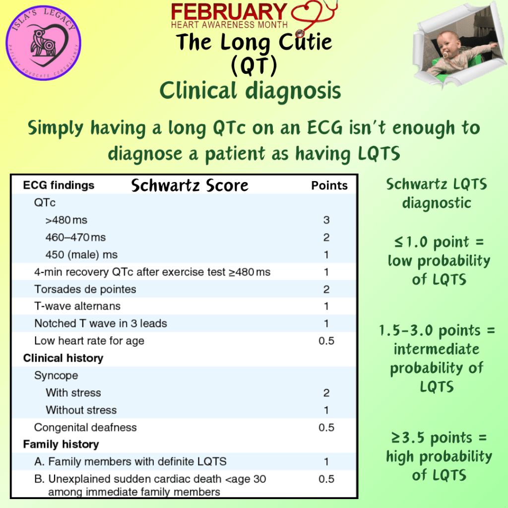The actual diagnosis of Long QT Syndrome can’t come from a single ECG, so don’t let an ER or A&E doctor tell you you have Long QT from one visit. A Long QT diagnosis remains anchored to the LQTS diagnostic criteria score (also known as the ‘Schwartz-score’), which is an important tool for the initial clinical assessment of patients suspected of having LQTS. It is composed of ECG findings, clinical history, and family history. Importantly, ECG findings should be interpreted in the absence of QT-prolonging agents or other reversible causes.
