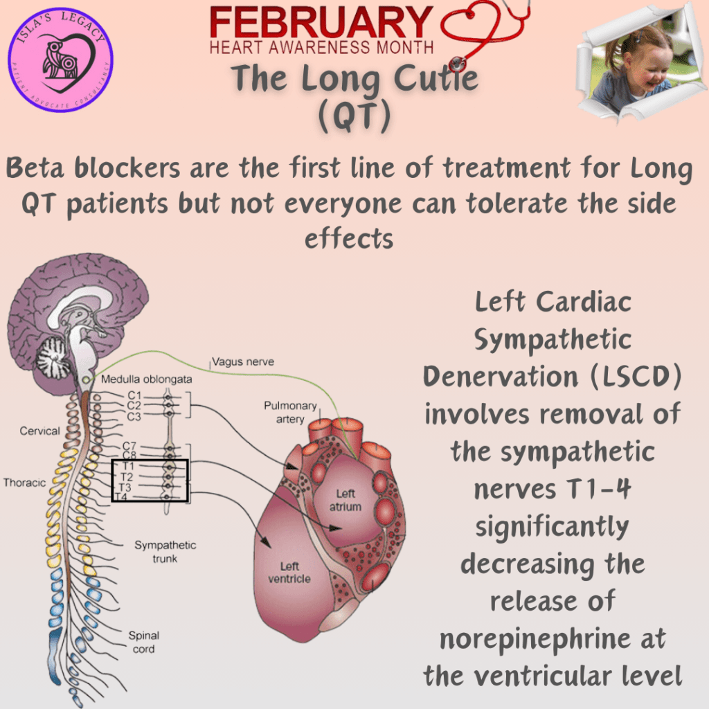 Arthur Moss performed the first left cardiac sympathetic denervation (LCSD) in a patient with the long QT syndrome in 1971. As opposed to beta blockers which simply block the ability of adrenaline to bond to beta receptors in the heart, LCSD removes the ganglia which supply adrenaline to the heart. In the same way beta blockers limit the heart’s reaction to adrenaline, LCSD reduces the QTc by minimising the QT stunning and stretching.