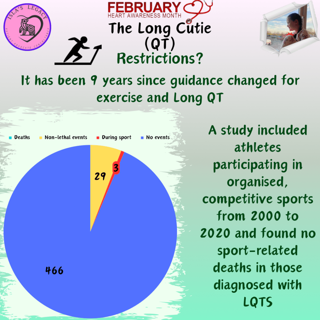 A 20 year study, including 495 athletes with LQTS participating in organised, competitive sports, found NO sport-related deaths. Long QT athletes had just over 1% chance of experiencing a non-lethal cardiac event during sports activities each year. Nonlethal cardiac events occurred in just 29 patients (5.9%); of the 15 events occurring in patients who were athletes at the time, only 3 occurred during athletic activity. 80% of the athletes were on beta-blockers and one-quarter had ICDs. “When you then allow those patients to exercise, the risk of cardiac events is actually low… In shared decision-making, we know the risk isn’t zero, but it isn’t necessarily higher if we do allow them to participate in exercise.” (Dalal)