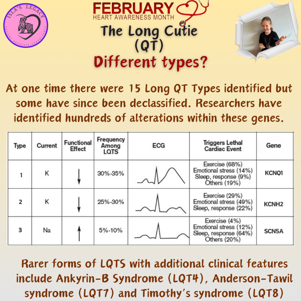 There are dozens of Long QT types but over the last few years some have been found to simply be natural heart responses to extreme circumstances. The genotypes (different gene mutations) can have thousands of phenotypes (presentations). This can be because the human genome is massive so even within the same gene (let’s say SCN5A) the mutation can occur anywhere along this sequence and that affects how severely the condition presents itself. So Isla’s SCN5A mutation caused a very dangerous form of Long QT 3, whereas someone with a maybe smaller or mutation somewhere else in the SCN5A gene, may have a less severe phenotype of Long QT 3.